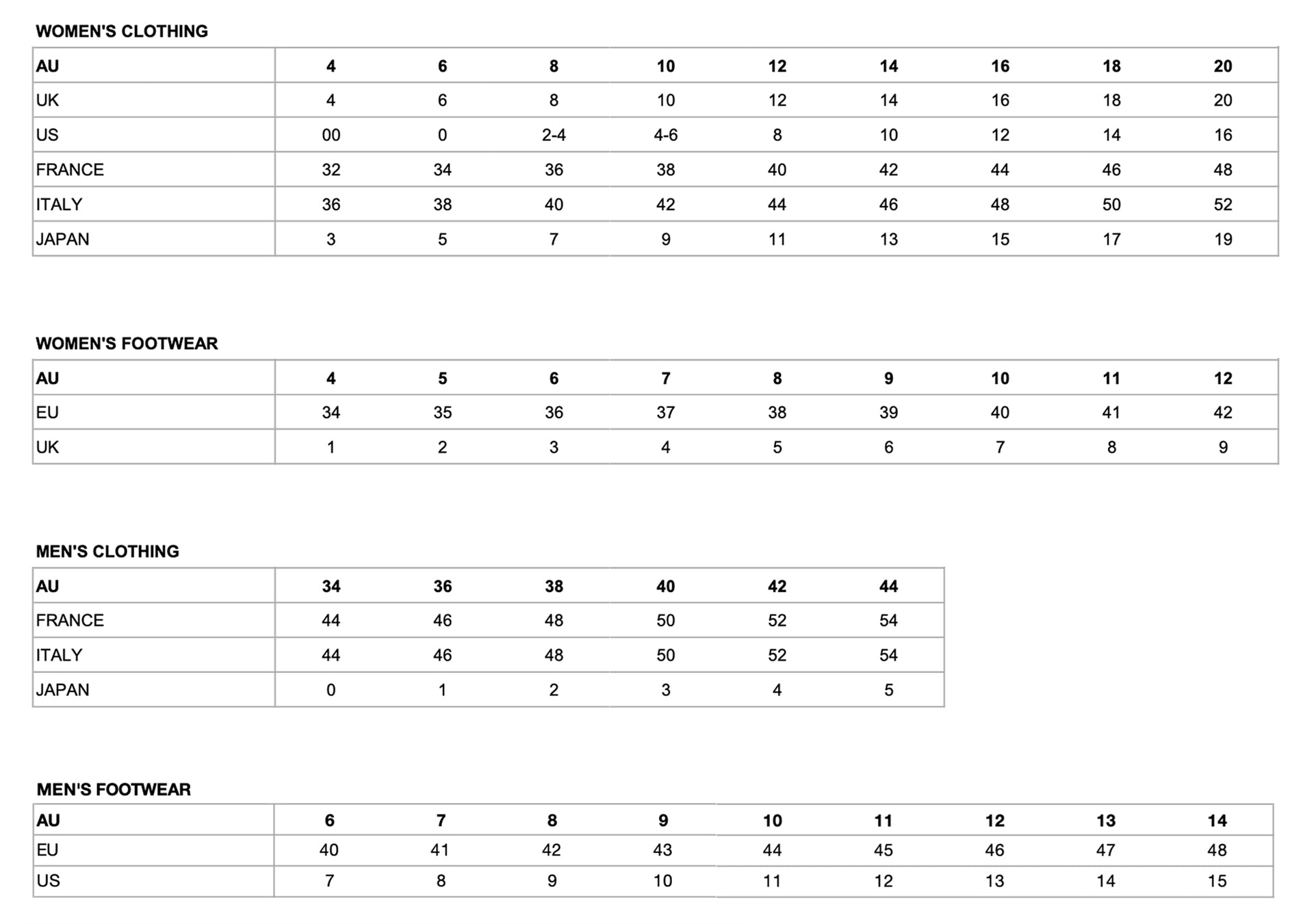 Note: These conversions act as a guide, and actual sizing can vary between brands. If you are unsure, please contact us for further assistance.